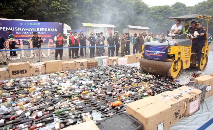 周三(11月12日),万丹海关总署(DJBC)主管Ambang Priyonggo(右)与丹格朗县检察长Afrillianna Purba(右二),和丹格朗副市长Pilar Saga Ichsan(右四)在万丹省丹格朗县印尼会展中心(ICE)举行的非法海关及消费税执法行动所得证据销毁活动中,使用重型机械销毁非法饮料。万丹省海关总署与丹格朗县检察院共同销毁了2024年至2025年期间执法行动中查获的非法海关和消费税证据物品,包括4150万支非法香烟和940升含乙醇饮料(MMEA)。这些物品价值高达537.6亿盾,并可能导致国家损失消费税收入达388.7亿盾。