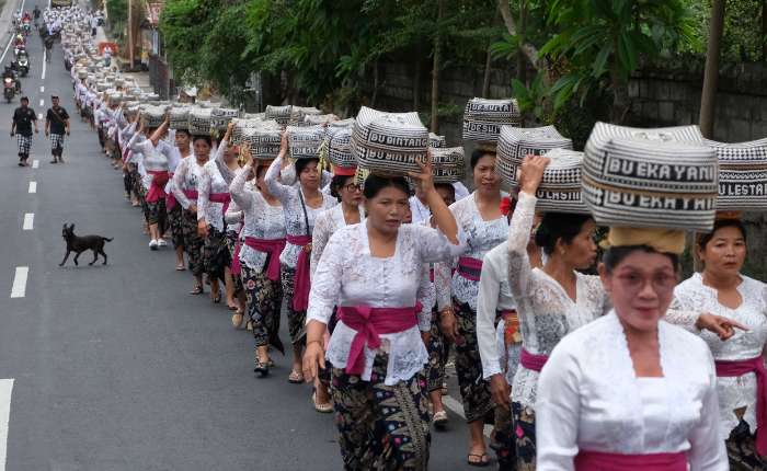 周三(11月19日),2025年加隆安(Galungan)节系列祭祀活动中,巴厘巴东(Badung)县卢克卢克(Lukluk)村的印度教徒身着统一制式的可芭雅(Kebaya)传统服饰,头顶承载祭品的竹编礼盘前往寺庙。每逢加隆安节庆典,当地数百名民众都会延续这一传统仪式--列队前行,手捧圣物祭品走向庙宇,庆祝 “达摩” (Dharma,代表美德)战胜 “反达摩” (Adharma,代表邪恶)的胜利之日。