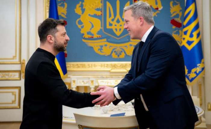 图为2025年11月20日,乌克兰总统泽连斯基与到访的美国陆军部长德里斯科尔(Daniel Driscoll)会谈。(Ukrainian Presidential Press Service/Handout via REUTERS )