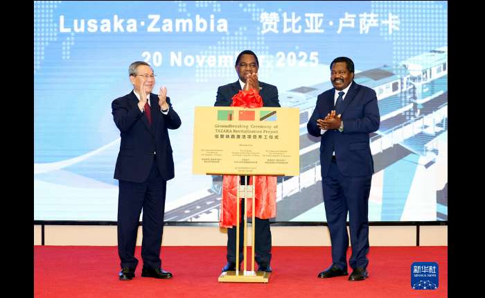 【中新社卢萨卡11月21日电】当地时间11月20日,中国国务院总理李强在卢萨卡同赞比亚总统希奇莱马、坦桑尼亚副总统恩钦比共同出席坦赞铁路激活项目开工仪式。