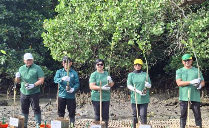 2025年11月23日(周日),印度尼西亚银行(印尼央行,BI)高级副行长Destry Damayanti(中)在巴厘岛贝诺瓦湾种植红树林,以抵消2025年“印尼创意作品展”(KKI 2025)产生的碳排放。印尼央行在巴厘岛贝诺瓦湾种植1,000株红树林,以抵消KKI 2025产生的126吨碳排放;同时,KKI 2025的融资对接规模达7820亿盾,较去年增长41%。