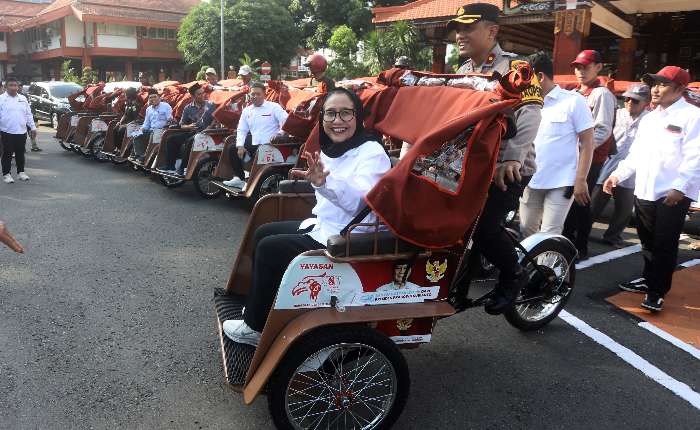 周二(11月25日)在东爪哇省莫佐克托(Mojokerto)县政府大楼前,国家团结运动(Gerakan Solidaritas Nasional /GSN)基金会副主席娜妮克.德扬(Nanik S Deyang,中)乘坐由普拉博沃总统捐赠的电动三轮车(当地称为betrik)。