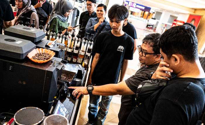 2025 年 11 月 26 日,观众在中爪省三宝垄Ciputra购物中心举行的“三宝垄咖啡周 2025”活动上查看烘焙咖啡豆的成熟度。