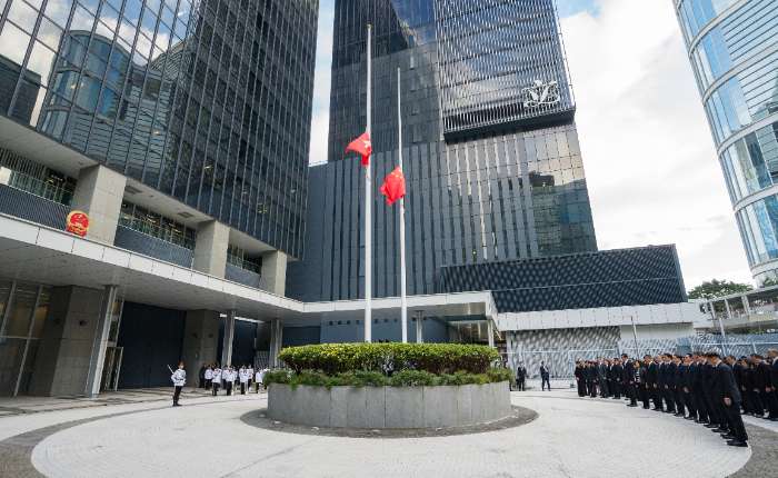 11月29日上午,香港特区在特区政府总部举行悼念活动,哀悼在大埔宏福苑火灾中不幸罹难的人士。特区政府建筑物国旗和香港特区区旗下半旗志哀。中新社