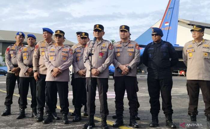 周六(11月29日),印尼国家警察行动局副局长Laksana警察中将在丹格朗南区的警察航空部队基地向记者记者发表声明。