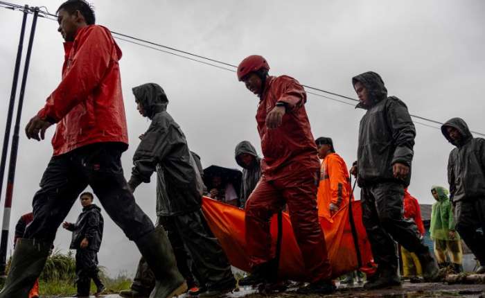 图为联合搜救队在南苏门答腊省阿加姆(Agam)县疏散受害者。
