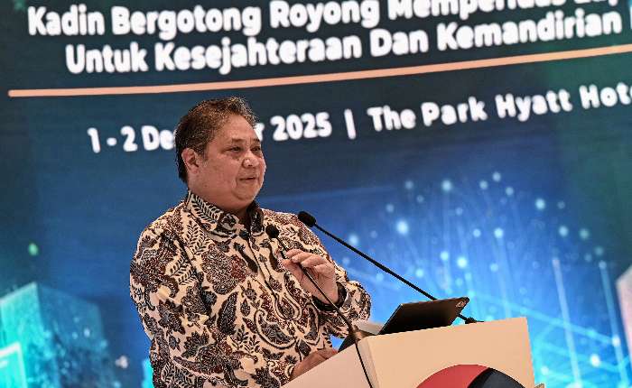 经济统筹部长艾尔朗卡•哈尔达托于12月1日在雅加达举行的印尼工商会全国领导会议上发表讲话。