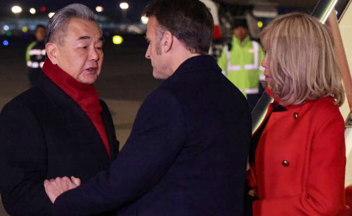 外交部长王毅(左)在北京首都国际机场迎接法国总统马克龙及其夫人布丽吉特。图片:路透社