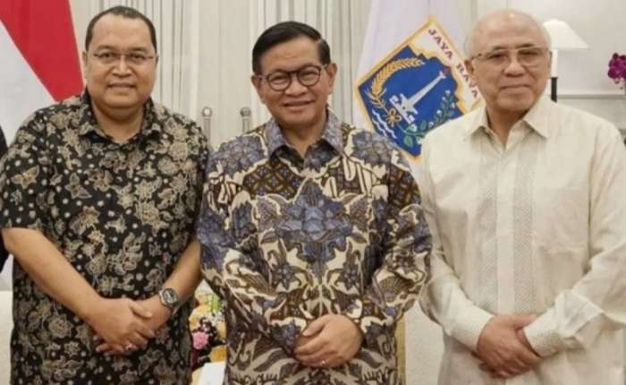 雅加达特区副省长普里延托退役少将(右)与雅加达特区省长普拉莫诺•阿农(中)举行工作会晤一瞥。