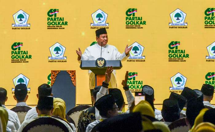 周五(12月5日),印尼总统普拉博沃.苏比安托(Prabowo Subianto)在雅加达出席从业党成立61周年庆典并发表讲话。