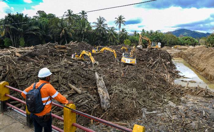 周四(2025年12月11日),在北苏门答腊省中塔帕努利县,工作人员正使用重型机械清理堵塞Aek Garoga河道的原木。