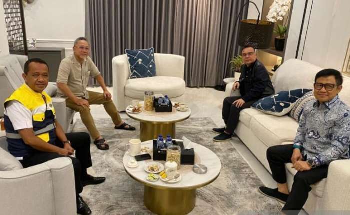 2025年12月28日,印尼雅加达,从业党总主席巴赫利尔·拉哈达利亚(左)、国民使命党总主席祖尔基弗利·哈桑(左二)、大印尼行动党秘书长苏夫米·达斯科·艾哈迈德(右二)与民族复兴党总主席穆海明·伊斯坎达尔(右)在巴赫利尔位于雅加达的住所举行联谊活动。