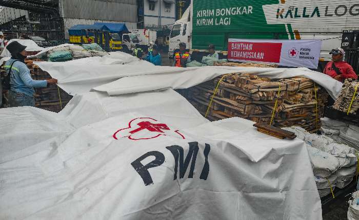 周五(1月2日)在雅加达丹戎不碌港的国内IKT码头,工人们正在准备将援助物资装载到船上。印尼红十字会(PMI)向苏门答腊岛受灾地区运送2500吨人道主义援助物资,以支持灾后恢复和重建工作。(pl)