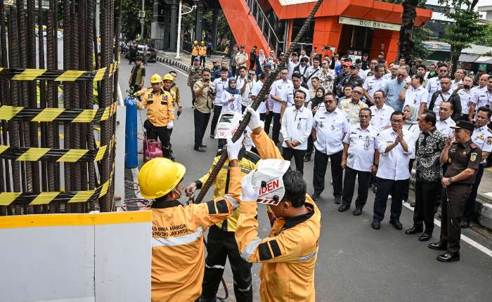 2026年1月14日,雅加达省长普拉莫诺(右三)与副省长拉诺(左二)、前省长苏迪约索(右二)、雅加达公共工程局负责人赫鲁·苏万多(左三)及雅加达检察院院长帕特里斯·尤斯里安·贾亚(右一)共同见证了位于雅加达拉苏娜·赛义德路单轨铁路支柱的拆除工作。