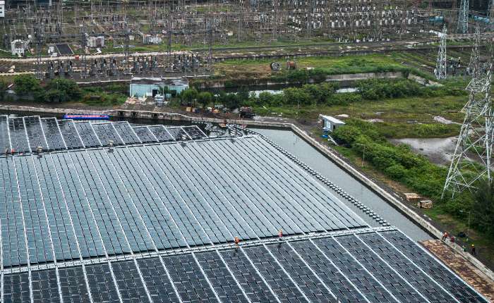 1月12日,在中爪哇省三宝垄市坦巴克洛洛克(Tambak Lorok),工作人员对漂浮式太阳能发电站进行维护作业。