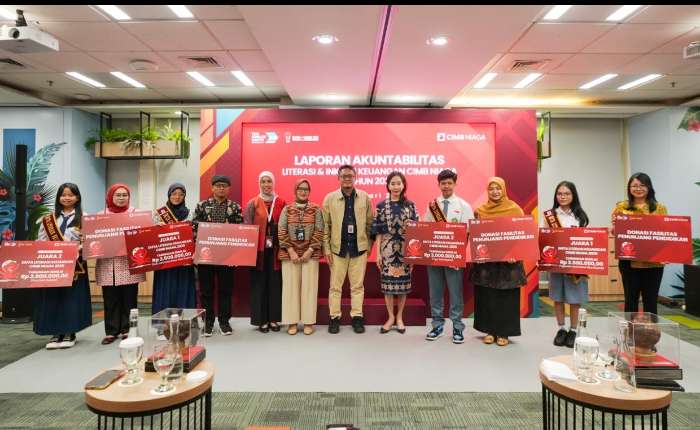 — 1月15日(周四),CIMB Niaga合规、企业事务与法律事务董事Fransiska Oei(右五)与金融服务管理局(OJK)金融教育与素养主任Cecep Setiawan(右六)、印度尼西亚银行(印尼央行,BI)普惠经济与金融集团主任Rosita Dewi(左六)、金融素养大使获奖学生及学校代表,在雅加达出席CIMB Niaga 2025年金融素养与普惠金融问责报告发布暨2026年项目启动活动期间合影。2025年,CIMB Niaga通过面向小学学生的“Tour de Bank”项目,以及面向初中和高中学生的“Ayo Menabung dan Berbagi”储蓄与分享计划,开展金融素养教育,覆盖29个城市的10,560名学生,并推动开立4,125个学生储蓄账户。2026年,类似项目将扩展至22个城市,旨在从小培养学生的储蓄习惯。