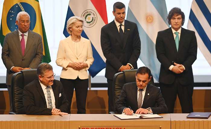 【新华社里约热内卢1月17日电】在历经逾25年谈判后,南方共同市场(南共市)与欧盟17日在巴拉圭首都亚松森正式签署自由贸易协定。此举被视为双方在全球地缘政治紧张、贸易保护主义抬头背景下,推动开放合作、迈向建设世界最大自贸区之一的重要一步。