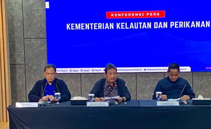 周六(1月17日),海洋与渔业部长萨克蒂.瓦赫尤.特伦戈诺(中),和印尼航空运输公司总经理特里.阿迪.威伯沃在雅加达KKP办公室向记者发表声 明。