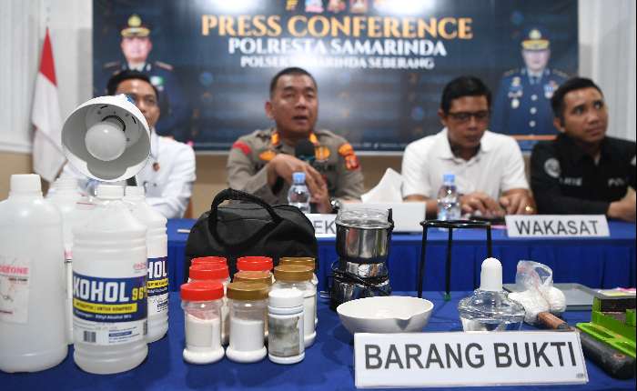 周一(1月19日)在东加里曼丹省三马林达(Samarinda)警察局举行的新闻发布会上,警方展示从一起毒品生产窝点案件中查获的多项证据。