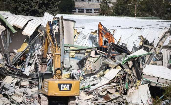 重型机械周二正被以色列占领的东耶路撒冷,拆除联合国近东救济工程处总部内的一栋建筑物。(图取自法新社)