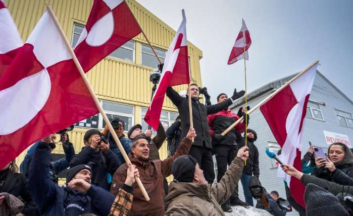 1月17日,在丹麦自治领地格陵兰岛首府努克,格陵兰岛自治政府总理延斯-弗雷德里克·尼尔森(中)与当地民众参加示威游行。新华社发(孔斯豪格摄)