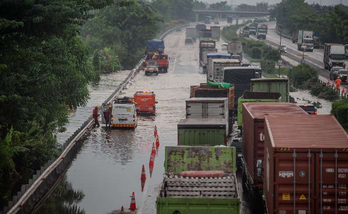 由于芝乌戎(Ciujung)河水暴涨和强降雨,洪水淹没了第一和第二条车道,水深约40厘米,导致从雅加达到孔雀港方向的交通拥堵,车辆只能通过第三条车道(快车道)通行。(pl)