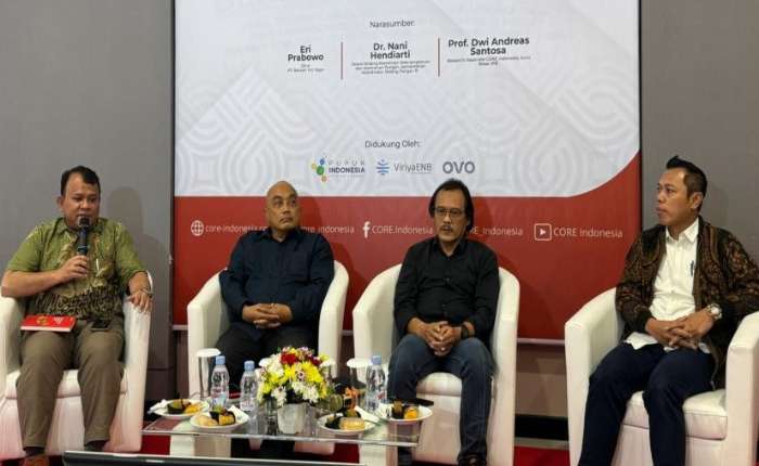 左至右 : Core Indonesia研究员Yusuf Rendy Manilet、Berkah Inti Daya公司总经理Eri Prabowo、印尼茂物农业大学教授Dwi Andreas Santosa、粮食统筹部粮食储备和粮食援助副部长助理Sugeng Harmono在雅加达出席讨论会。