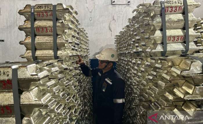 位于邦加勿里洞省西邦加县Muntok市的PT Timah仓库中的锡锭产品。