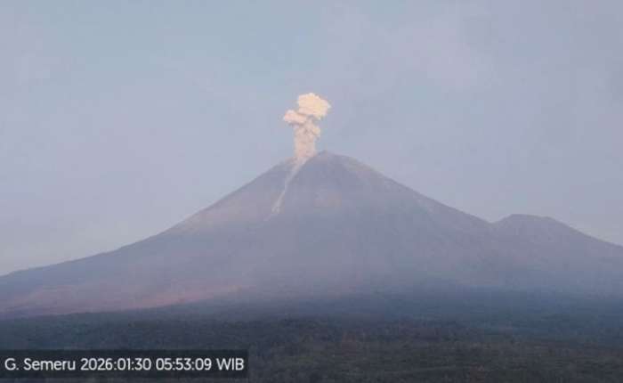 【本报讯】位于东爪哇省卢马詹县和玛琅县边界的塞梅鲁火山(Gunung Semeru)于周五(1月30日)上午发生了三次喷发,喷发柱高度达到1公里。