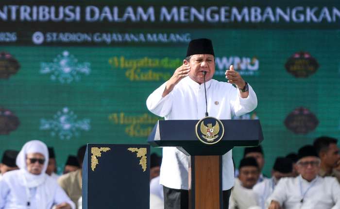 普拉博沃总统在出席东爪哇省玛琅市加亚亚纳体育场举行的“伊斯兰教士联合会百年大庆祷告会”上发表讲话。