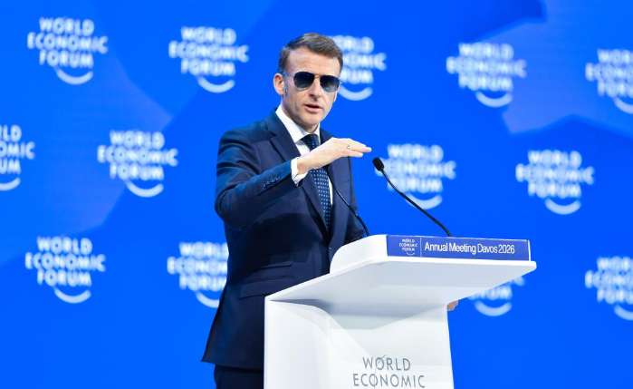 1月20日,法国总统马克龙在瑞士达沃斯举办的世界经济论坛2026年年会上讲话。新华社记者连漪摄