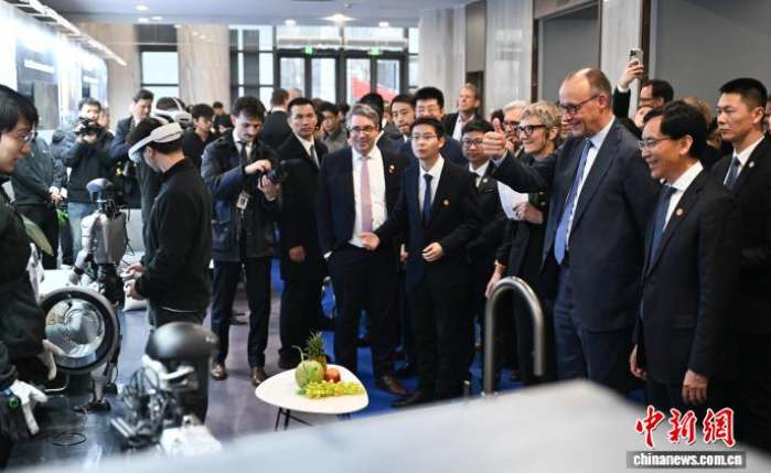 【中新网2月26日电】德国总理默茨26日抵达浙江杭州,继续中国之行,根据行程,默茨下午在浙江杭州率团参访宇树科技。参过过程中,默茨竖起大拇指点赞宇树科技。