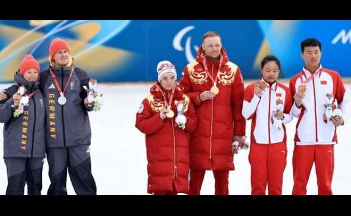 争议一幕发生在本周二的冬残奥会越野滑雪赛后颁奖仪式,俄罗斯运动员巴吉扬获得了金牌,德国选手卡兹迈尔获得银牌,中国选手丛吉鸿获得了铜牌。