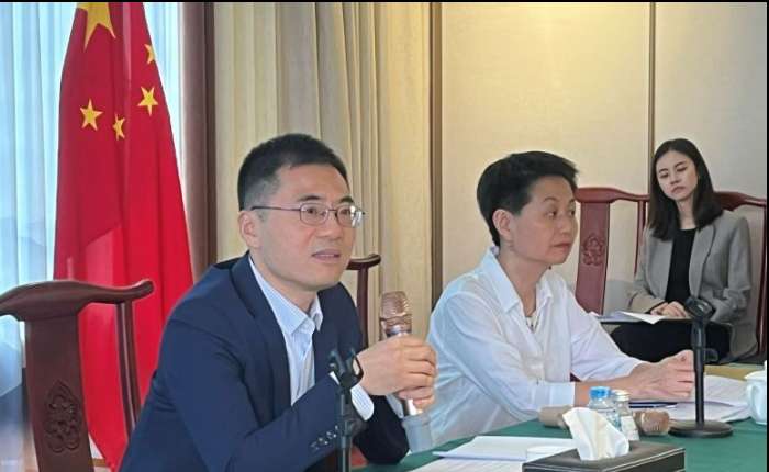 中国驻东盟大使王擎(左)在雅加达与媒体和智库的会议及对话活动中发表声明。