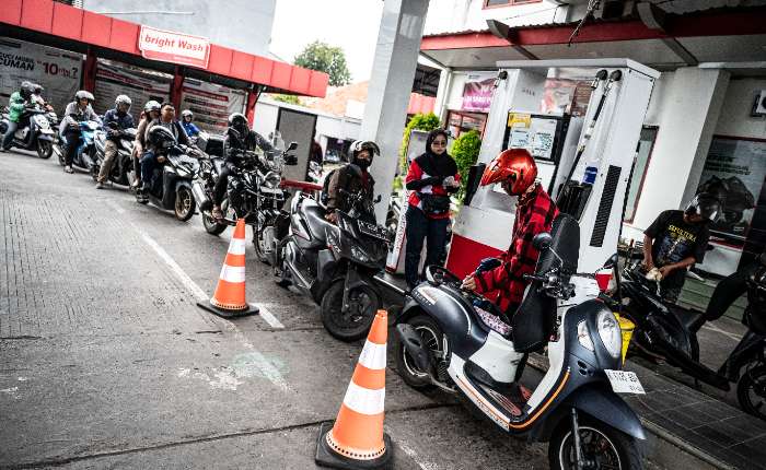 周二(3月31日),在中爪哇省三宝垄市一加油站排队加油盛况。