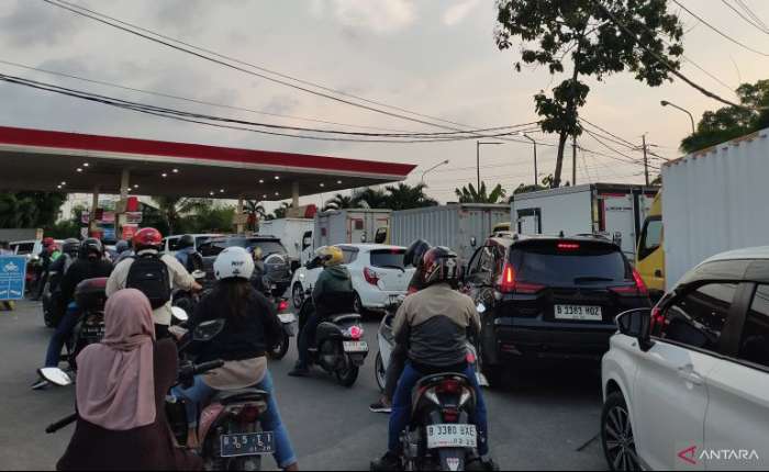 周二(3月31日)下午,位于雅加达西区Daan Mogot路的Pesing加油站,车辆排起了长龙。