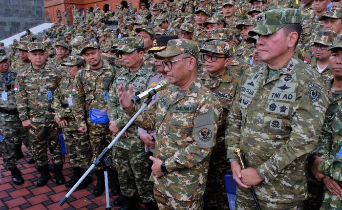 周三(4月15日),印尼国家安防机构(Lemhannas)所长TB. Ace Hasan Syadzily(右二),在军事学院院长Rano Tilaar少将(右)的陪同下,在中爪哇省马格朗军事学院综合区举行的印尼全国地方议会议长(DPRD)静修会欢迎仪式上致辞。印尼国家安防机构举办地方领导人巩固课程(KPPD),以全国静修会的形式在马格朗军事学院进行,共有来自印尼各地的478名地方议会议长参加,活动时间为2026年4月15日至19日。