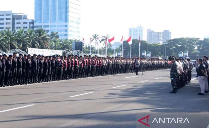 【本报讯】雅加达中央警察局部署了1948名联合人员,为周四(4月16日)在国会大楼区域举行的,由印尼金属工会联合会中央领导委员会(DPP FSPMI)及数个社会元素发起的示威活动提供服务。