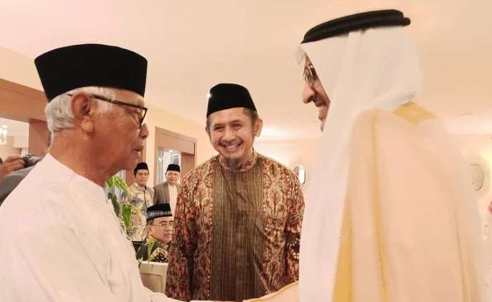 沙特阿拉伯驻印尼大使费萨尔•阿卜杜拉•阿莫迪(右)在其官邸迎接印尼伊斯兰教士理事会总主席 KH•安瓦尔•伊斯坎达尔(左)的到访。