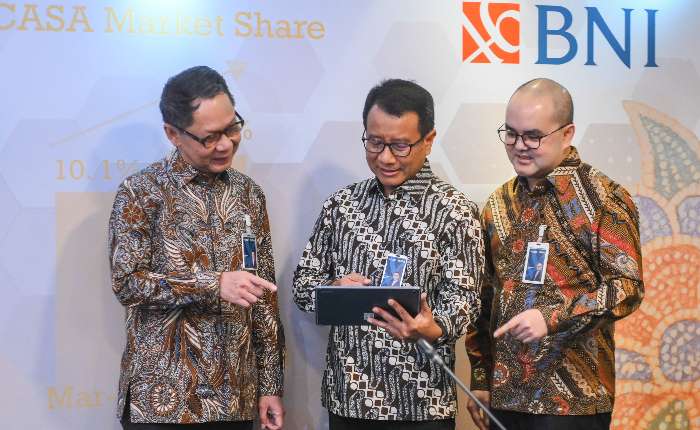 图为周三(4月29日),印尼国家银行(BNI)总裁Putrama Wahju Setyawan(中)、金融和策略总监Hussein Paolo Kartadjoemena(右)与风险管理总监David Pirzada(左)在雅加达举行的BNI 2026年第一度业绩发布会时交谈。2026年第一季度BNI的净利达5.6万亿盾,同比增长5.21%。